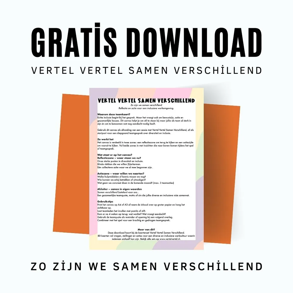 Tijdens het gebruik van Vertel Vertel Samen Verschillend ontstaan vaak waardevolle gesprekken, goede ideeën en concrete teamafspraken. Met dit kleurrijke canvas leg je die makkelijk vast – speels én praktisch.